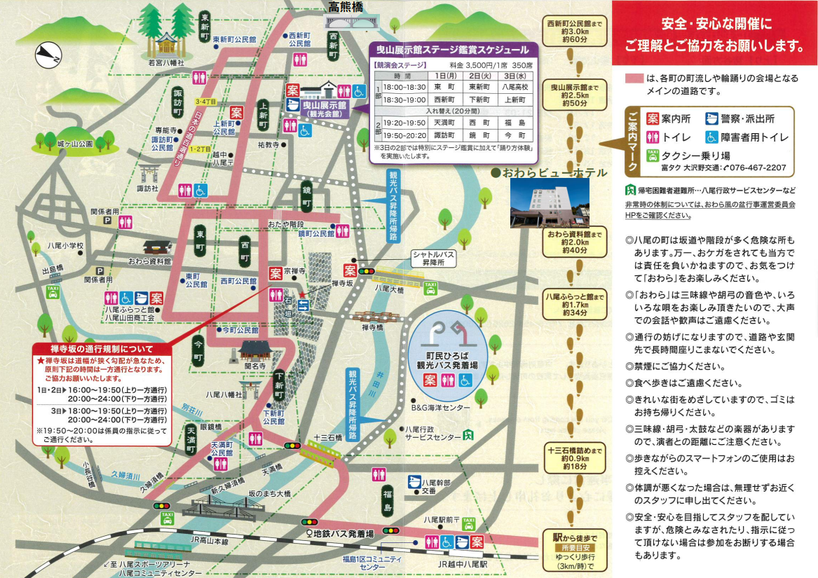 ・前夜祭期間中は、夜19:30から八尾旧町の中心にある、当ホテル直営の“オワラ町の駅”までご案内いたします。